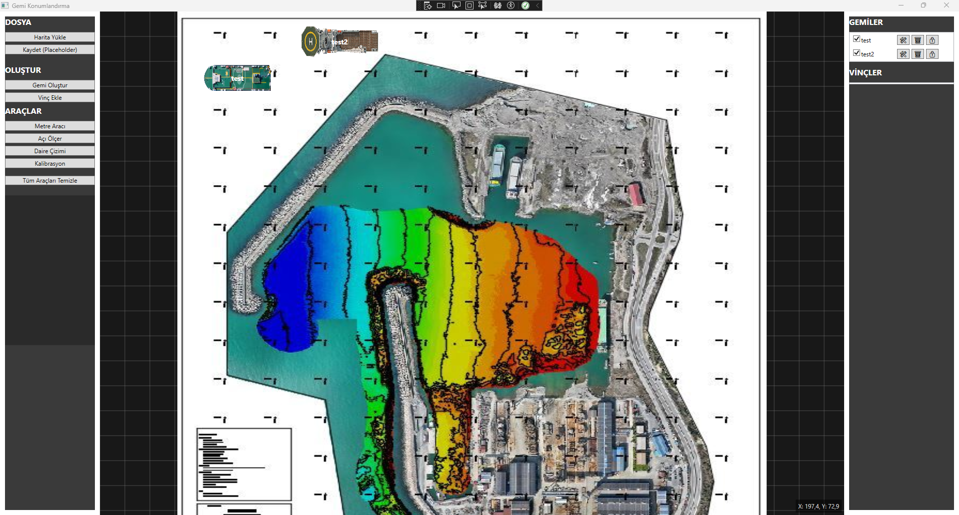 Müşteriye özel olarak yapılan bu uygulamada limanın haritası sisteme yüklenerek kalibre ayarı yapılır. Bu kalibre ayarı gerçek mesafe bilgisi için kullanılır. Yapılan bu ayar sayesinde sisteme çeşitli gemi ve vinçler ekleyerek gerçek uzunluklarını kullanabilir. Eklenen gemi ve vinçlere özel isimler verebilir, konumlarını istediği gibi ayarlayabilir, vincin açık kapalı durumunu yönetebilir. Metre araçları sayesinde ölçümler yapabilir. Kalibrasyon ayarı sayesinde gerçek mesafe ile çalıştığından limanın düzenlemesini uygulama üzerinden yaparak gerçek hayata yansıtabilir.